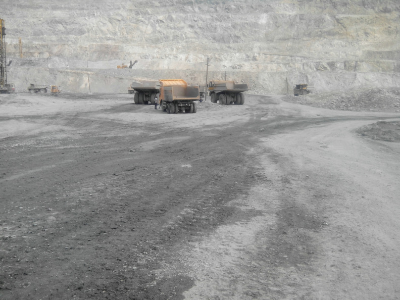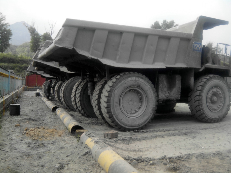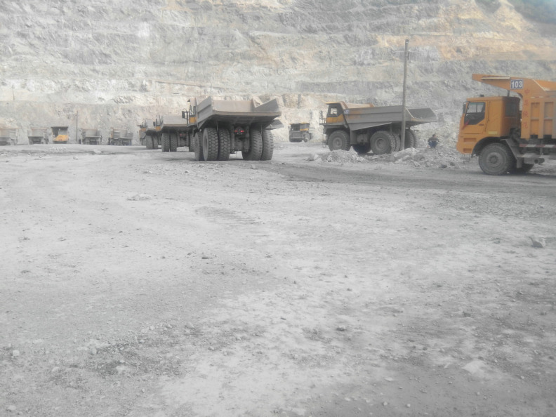 在钼矿项目现场,倪总协调生产副总孙总带领泰凯英考察人员对该矿区采运路况、剥离采运规模、行驶坡度、运距、车速、车辆运行状况、废胎区、年度温度环境等数据进行调研了解,并重点对TR50刚性卡车和陕汽中集宽体车进行调研。在车辆休息区和维修站,考察人员上车考察,重点对标配21.00R35轮胎进行检查、胎压监测、测量数据、病象分析。经调研发现该矿车辆管理非常规范,杜绝了超速超载的现象,车队管理和轮胎维修也较完善较规范。但该矿的装载区和卸料区路面非常恶劣,布满尖石,该车队轮胎大部分的病象均为扎伤、划伤。