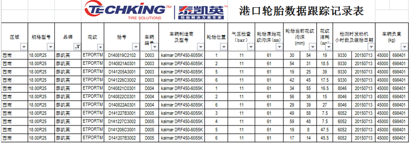 2015年7月,泰凯英工程师走访了西南某大型集装箱码头,实地考查了新一代的港口流机设备专用轮胎的使用表现,经过专业的测量和科学的对比,证实泰凯英ETPORTM系列港口流机设备专用轮胎取得了优异的表现。详细数据如下: